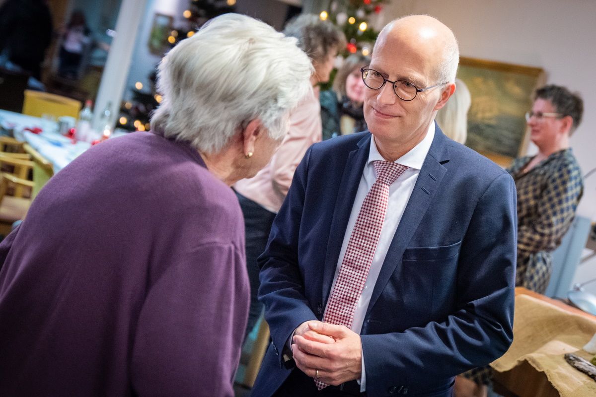 Schon im Januar fragten wir bei der Hamburger Senatskanzlei an, ob Herr Tschentscher auf unserer Weihnachtsfeier 2019 ein Grußwort entrichten könne an die Bewohnerinnen und Bewohner. Wir konnten es kaum glauben, als dann im März tatsächlich die Zusage kam. Es ist zwar guter Brauch, dass jedes Jahr ein namhafter Vertreter aus Politik, Wirtschaft oder Wissenschaft der Stadt zur Weihnachtsfeier der Diesterweg-Stiftung geladen ist, aber dass sich der Erste Bürgermeister die Zeit für eine kleine Festrede nehmen würde, damit hatten wir nicht gerechnet. Im Anschluss an die Feier nahm sich der Ehrengast sogar noch die Zeit für Gespräche mit Bewohnern und Mitarbeitern.