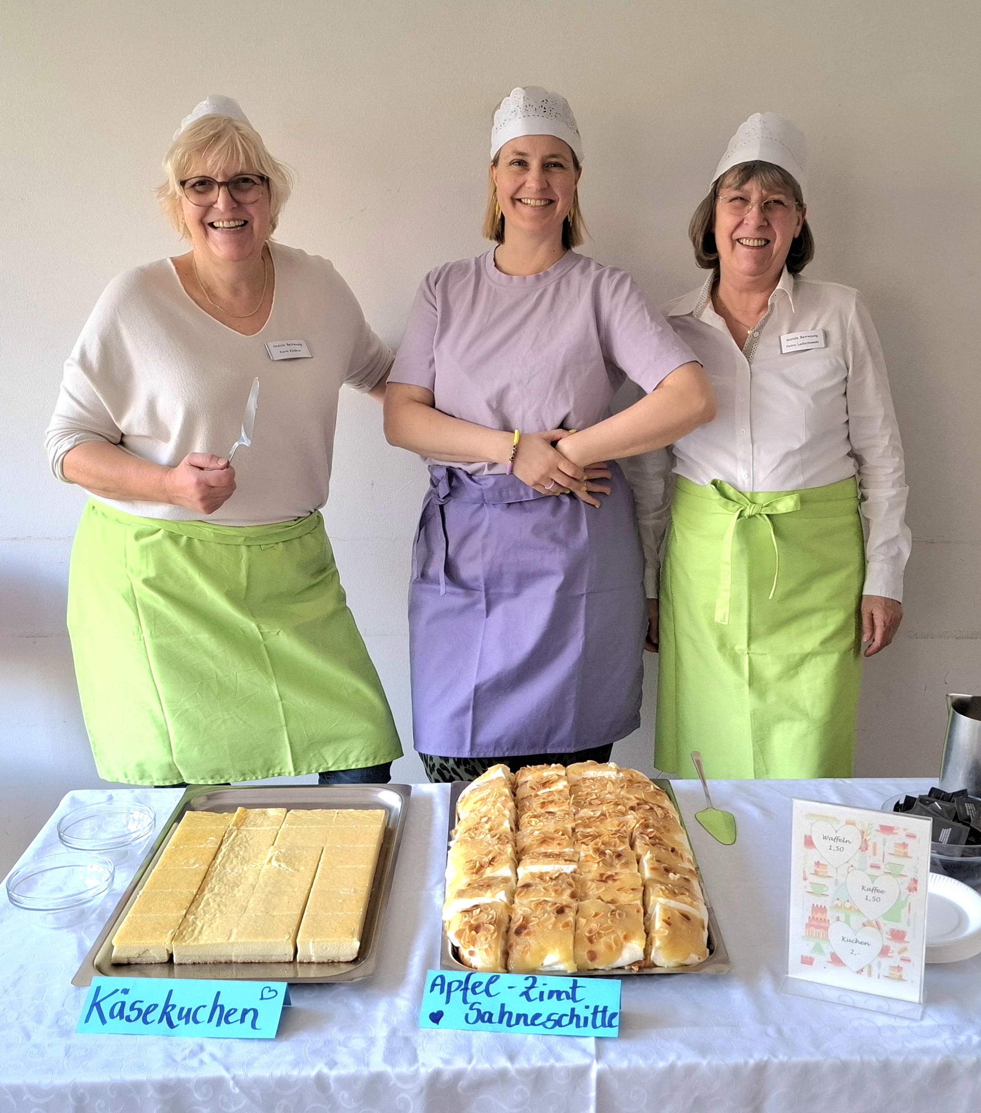 Es wurde über Herstellungstechniken gefachsimpelt, probiert, geschmeckt, gerochen, angefasst, in Erinnerungen geschwelgt. Und dann fuhr die von der Küche und Sozialen Betreuung in der eigens für diesen Tag gestalteten „Diesteria“ sämtliche kulinarische Register mit frisch gebackenem Käsekuchen, Apfel-Zimt-Sahneschnitten, heißen Waffeln und Kaffee! Die Gäste konnten drinnen und auf der sonnig-warmen Terrasse die Leckereien wohlumsorgt mit netter Musik genießen.