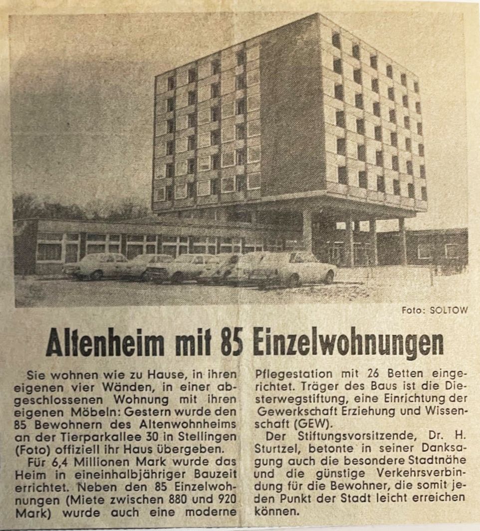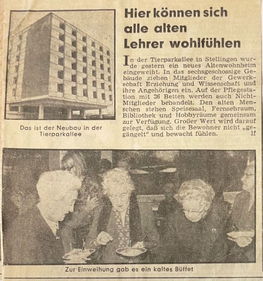 In der Tierparkallee in Stellingen wurde gestern ein neues Altenwohnheim eingeweiht. In das sechsgeschossige Gebäude, zehn Mitglieder der Gewerkschaft, Erziehung und Wissenschaft und ihre Angehörigen ein. Auf der Pflegestation mit 26 Betten werden auch Nicht-Mitglieder behandelt. Den alten Menschen stehen Speisesaal, Fernsehraum, Bibliothek und Hobbyräume gemeinsam zur Verfügung. Großer Wert wird darauf gelegt, daß sich die Bewohner nicht „gegängelt“ und bewacht fühlen.