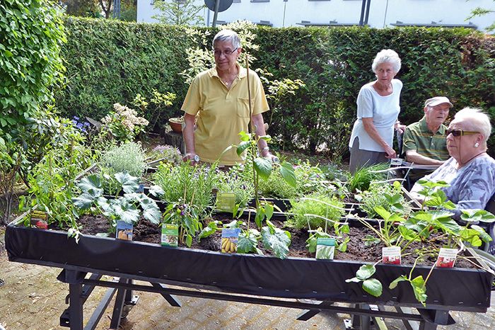 Doch es lässt sich nicht leugnen: die Gartenanlage ist in die Jahre gekommen und bedarf einer Auffrischung. Ein Anfang mit der Neugestaltung eines Hochbeets ist gemacht: die frischen Kräuter- und Gemüsesetzlinge wachsen unter der liebevollen Pflege von Frau Schumacher, einer Mitarbeiterin der Sozialen Betreuung, gut an und erfreuen Tag für Tag die Bewohnerinnen und Bewohner.